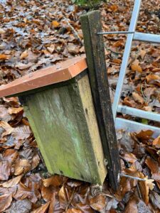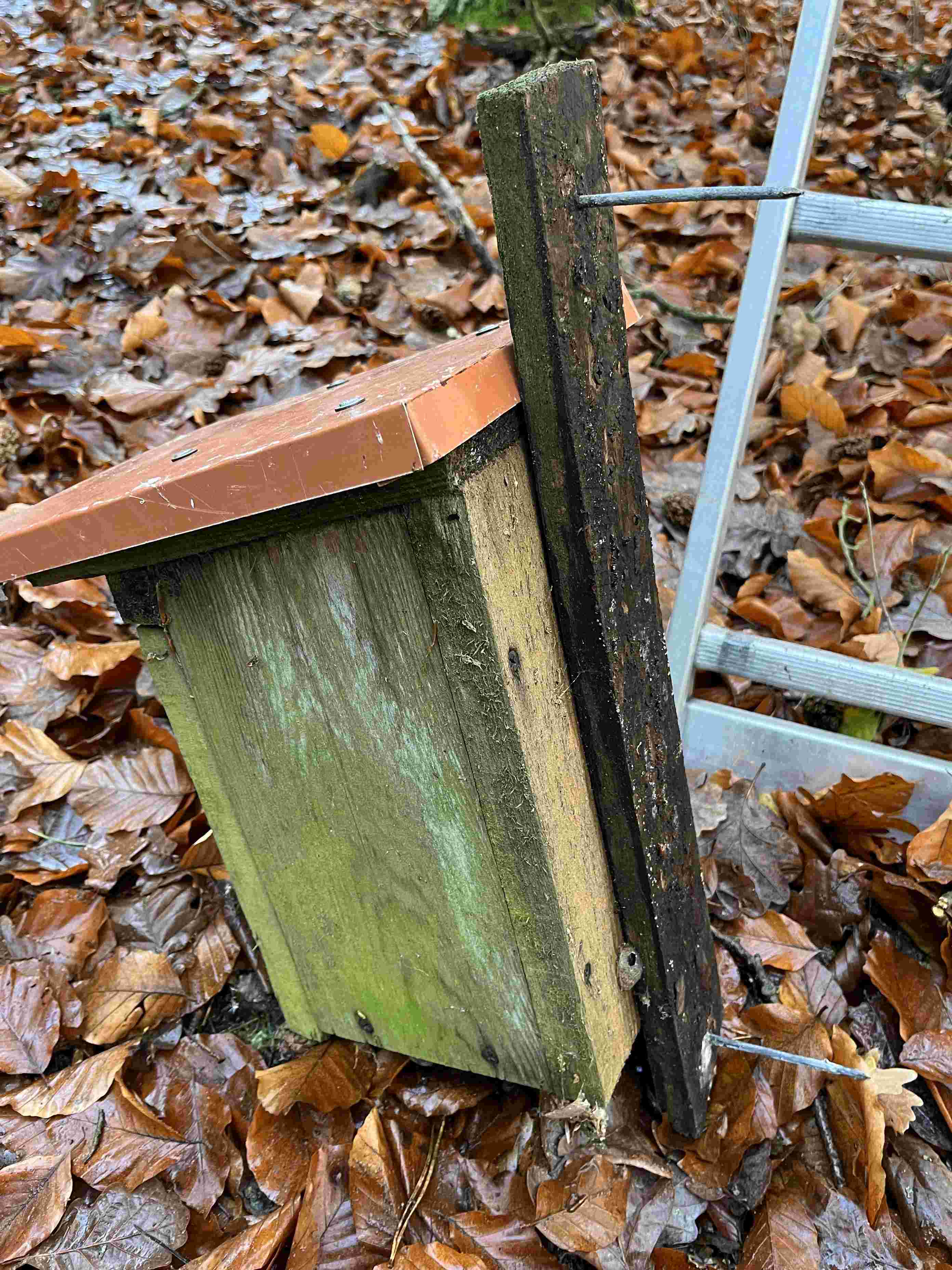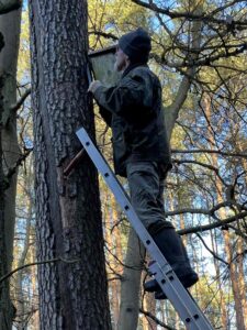 Na dzień dzisiejszy wszystkie budki są już zdjęte. Robota poszła sprawnie, a w lesie nie pozostał po nich żaden ślad. Budki mocujemy do drzew przy pomocy gwoździ bitych prze powiększaną podkładkę. Dzięki temu w większości przypadków rosnące drzewo “wypycha” budkę, a nam taka powiększona główka gwoździa umożliwia sprawne zdjęcie budki.