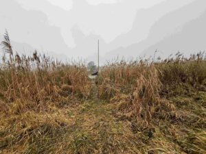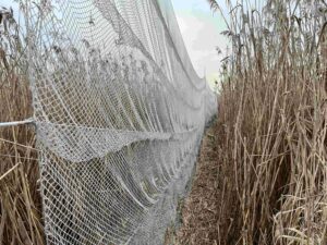 Łapanie nad stawem w dolinie Wełny. W trzcinowiskach ustawiliśmy 130 m sieci, a w wykopie stawu 70 m sieci o oczku 60×60 mm oraz jedną pułapkę tunelową typu “wacek”. Odłowy prowadziliśmy przez 5 wieczorów, 3 całe dni i 3 poranki.